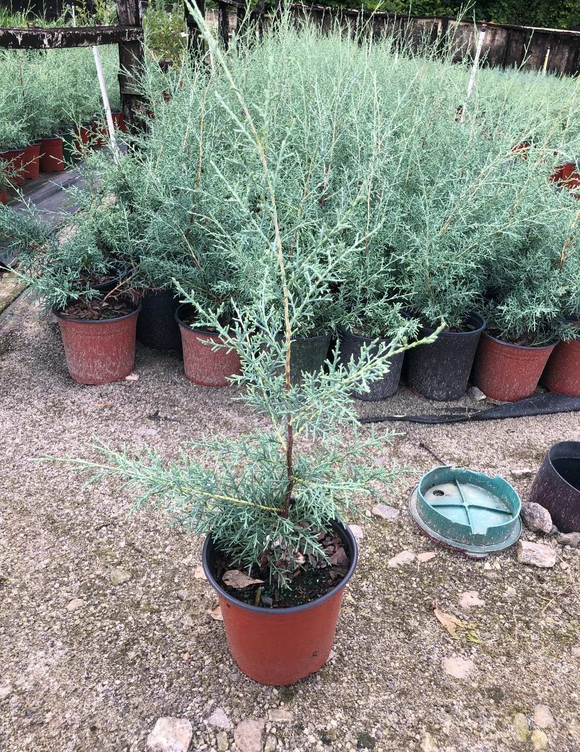 Carolina Sapphire: The Carolina Sapphire is a fast-growing, evergreen tree known for its conical or pyramidal shape and silvery-blue foliage. It features scale-like leaves, a loose branch structure, and is highly drought-tolerant once established, making it a low-maintenance option for privacy screening or as a landscape accent. This tree can grow to be 30–40 feet tall and 15–20 feet wide, thrives in full sun, and is recommended for hardiness zones 6–9.