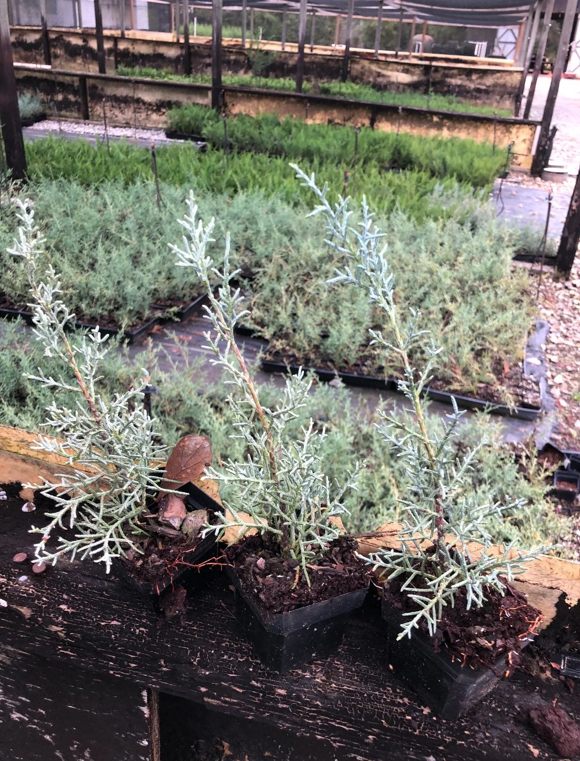 Silver Smoke: The Silver Smoke Cypress is an evergreen tree known for its striking, smoky silver-blue foliage, which has a unique smoky appearance against its reddish-brown bark. It grows in an upright, conical shape, reaching 15 to 30 feet tall and 8 to 10 feet wide. This fast-growing tree is tolerant of heat, drought, and deer, making it a good choice for privacy screens or as a specimen plant in full sun and well-drained soil.