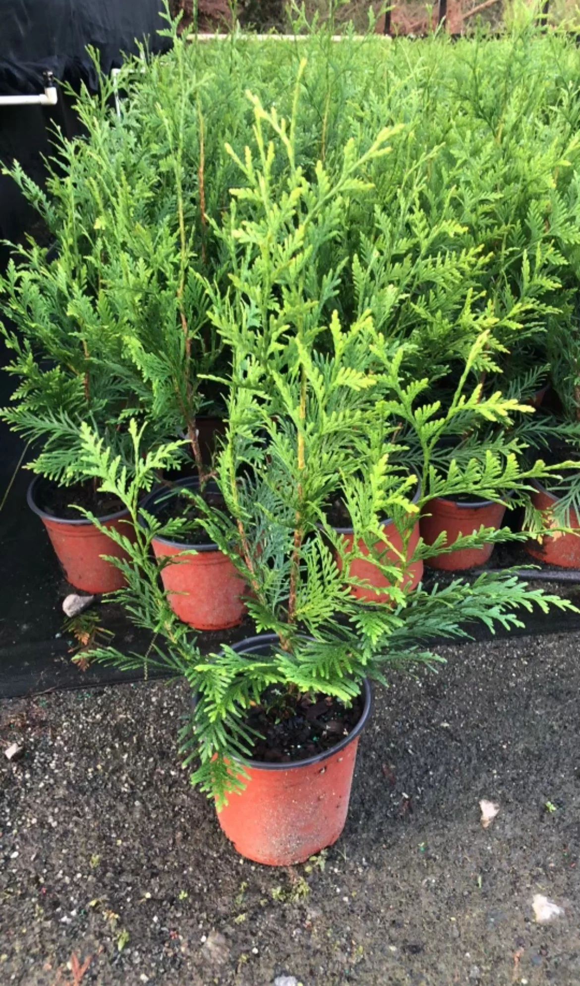 Green Giant: Green Giant is a fast-growing, pyramidal evergreen conifer known for its dense, dark green foliage that remains vibrant year-round. It is a hybrid of the Western Redcedar and Japanese Arborvitae and is widely used for privacy screens, hedges, and windbreaks. The tree is hardy, resistant to most pests and diseases, and requires minimal pruning to maintain its shape. It typically grows 40 to 60 feet tall and 12 to 18 feet wide